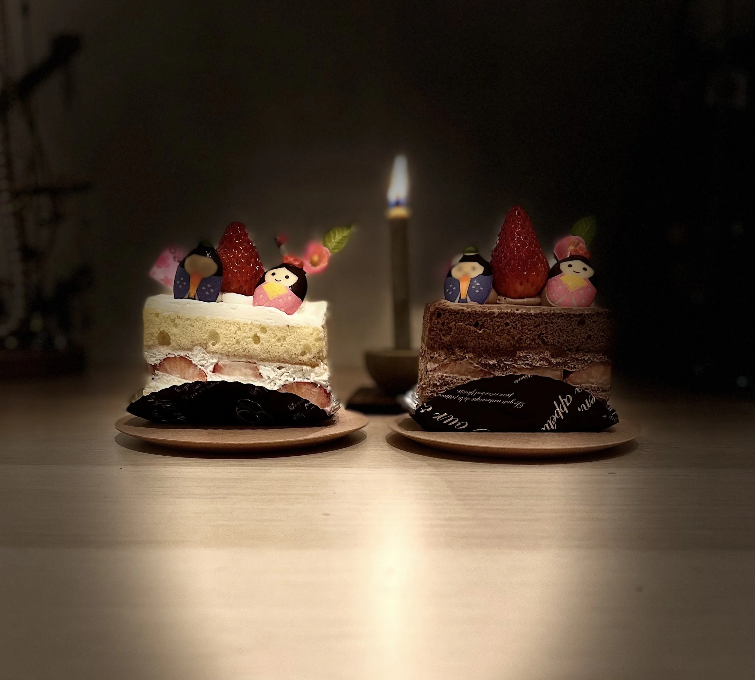 今日ウチに帰ると、ケーキの箱が冷蔵庫のはじっこにこっそり突っ込んであった。箱を開けたらおひなさまケーキ。